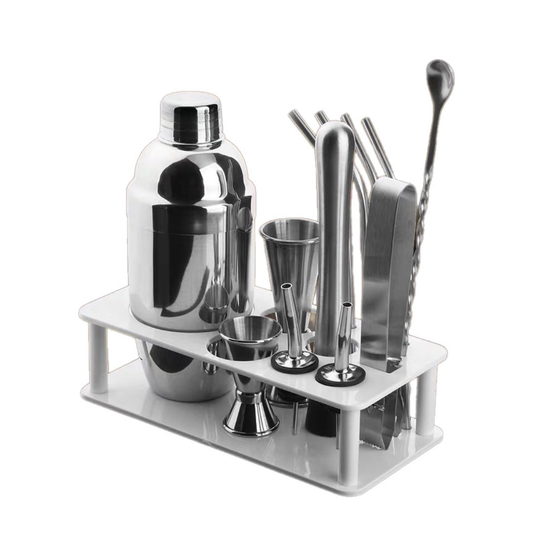 Bartender Kit with Whiskey Smoker 13 pcs Bamboo Stand Bar Set Silver Steel Color