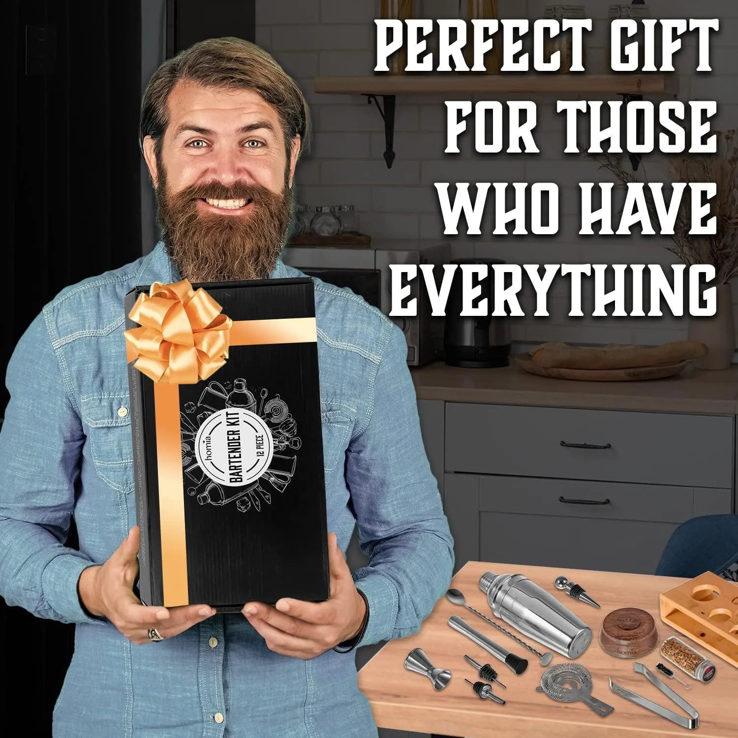 PREMIUM QUALITY AND COMFORTABLE SIZES: The best thing about this stainless steel cocktail shaker is that it's durable, leak-proof, and lightweight! You won't have to worry about any rust or scratches on your new favorite tool, too. The sleek wooden base and stylish design of the set will fit into any setting, and the compact size means it won't take up too much space. Dimensions: Shaker 3.5x9.3" (23.6 Oz), double jigger 1.4x2.7" (0.5/1 Oz) and Cocktail Smoker, 4.5" in diameter.